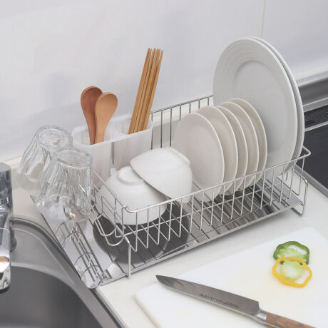 [型番:413870]【デザイン】●奥まで置けて作業スペースを広々と使えます。●しっかりシンクまで水を流せる傾斜構造です。●右置き用・左置き用の2種類から選べます。【スペック】サイズ/約幅41.8×奥行25.2×高さ14cm付属品含まず重量/約1.2kg内容量/1個付属品:トレイ、箸立て(各1個)材質/本体:18-8ステンレストレイ:ステンレススチール箸立て:ポリプロピレン種類/右側、左側生産国/日本製耐荷重/約2kg