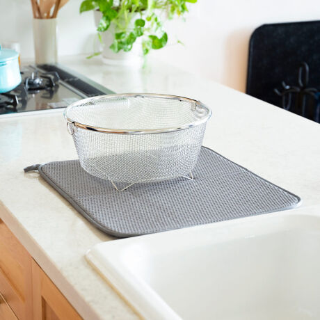 ●食器を直に置いても、水切りかごの水受けとしても、厚手のマットがしっかり吸水します。