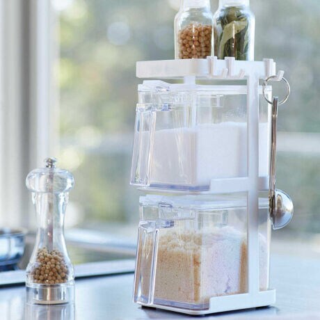 ●砂糖や塩などを入れておくのに便利な調味料ストッカーL(約650ml)2個とスリムなラックのセットです。