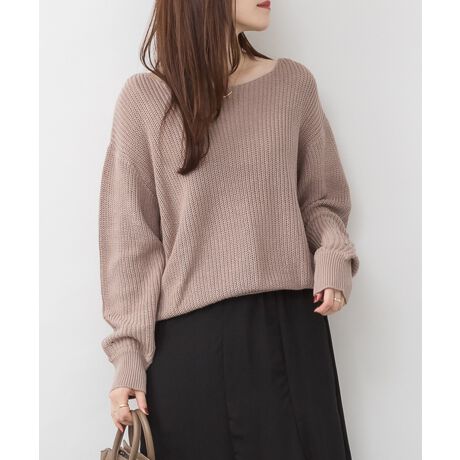広めのネックラインが洗練された印象を与え畔編みの独特な生地感がスタイリッシュな雰囲気を演出します。