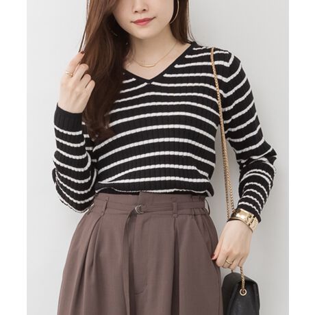 ボーダーVネックリブニット