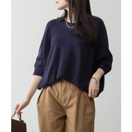 首周りをキレイに見せるVネックと程よい開きのクルーネックに加え、ゆったりとしたルーズフィットのドルマン袖がリラックス感と女性らしさを演出します。