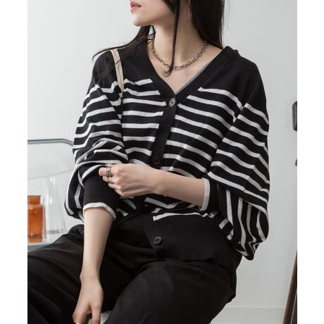 aity アイティ ボーダーがシンプルながらも視覚的にアクセントを加えキーネックデザインがスタイリッシュな印象を与えるコットンニットカーディガンです。