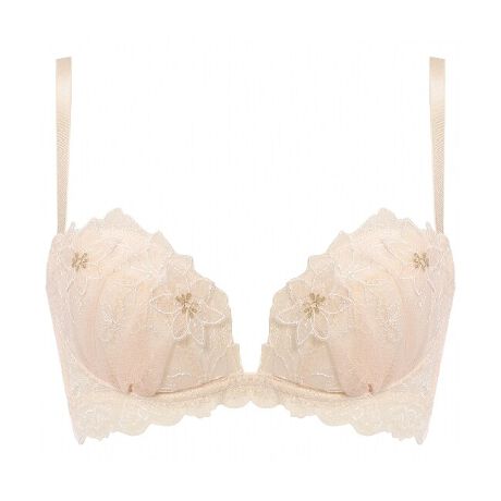 センターが低めで、カップ脇をすっきりしたラインにすることで、バストを内側にプッシュして谷間を作ります。