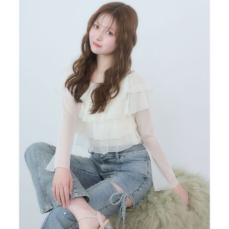 繊細なチュールを重ねた、華やかなフリルトップス。