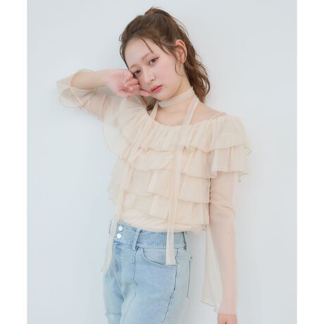 繊細なチュールを重ねた、華やかなフリルトップス。