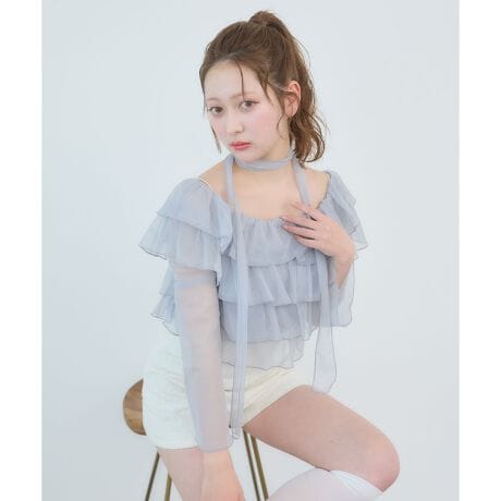繊細なチュールを重ねた、華やかなフリルトップス。