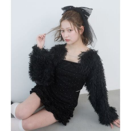 ボレロは毛足の長いフリンジ素材がやわらかな存在感を放ち、コーディネートにロマンティックな雰囲気をプラスしてくれます。