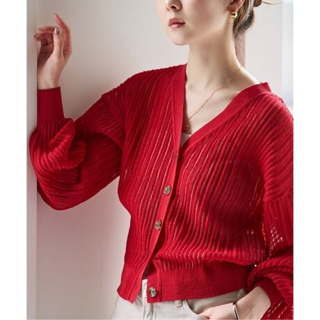 シアー素材×立体的な表面感のリブが着映えを促すニットカーディガン。