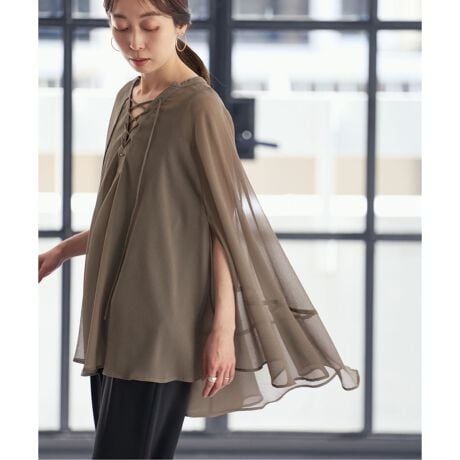 シアーな楊柳素材をたっぷりと使用したフェミニンなムードを纏えるケープ型ブラウス。