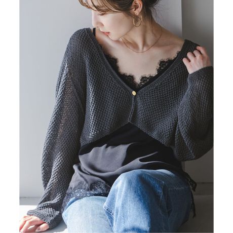 ぺーパーヤーンを使用したシャリ感のある独特な風合いに、表面感のある編地が清涼感漂うニットカーディガン。