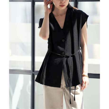 リネンブレンドのさらっとしたタッチが人気のファジーリネン素材を今回はジレ風で着られるブラウスがに。