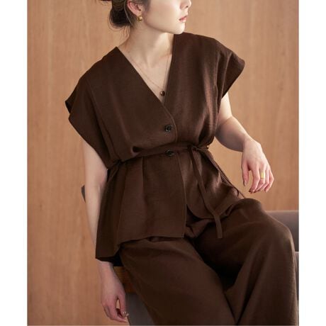 リネンブレンドのさらっとしたタッチが人気のファジーリネン素材を今回はジレ風で着られるブラウスがに。