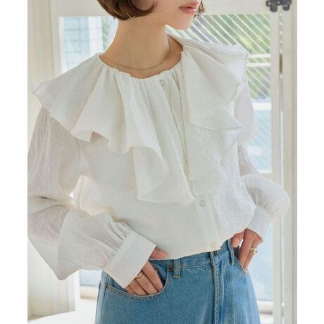 大きなフリルカラーが顔周りを彩りアクセいらずで存在感のあるスタイリングに。