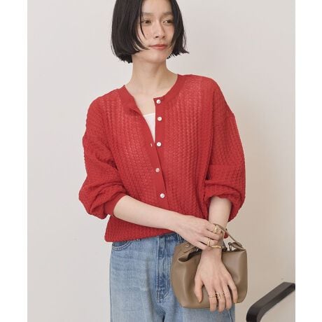 一枚で決まる、上品透かし編み2WAY前後2WAYで着用できるデザインが魅力のニットカーディガンです。ボタンデザインを前にすれば軽やかな羽織りとして、後ろにすればシンプルなトップスとして楽しめます。その日の気分やコーディネートに合わせて印象を変えられるため、着回し力の高さも魅力です。透かし編みの立体感ある編み地が、シンプルながらも奥行きのある表情を演出します。程よいゆとりのあるシルエットで、インナーとのレイヤードも快適です。パンツにもスカートにも合わせやすく、デイリーからお出かけまで幅広いシーンで活躍します。季節の変わり目に重宝する、頼れる大人カジュアルアイテムです。透け感[あり]