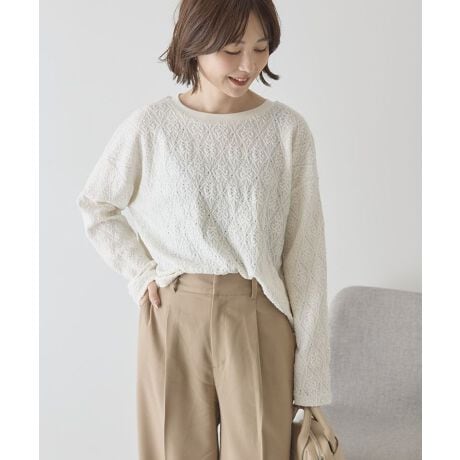 一枚で華やぐ、大人の総レース。繊細な総レースが目を引く華やかなプルオーバーです。立体感のあるレース柄がコーディネートに奥行きを生み、シンプルなボトムと合わせるだけで着映えします。ほどよくゆとりのあるシルエットで、甘さがありながらも大人カジュアルにまとまります。デニムやワイドパンツと合わせれば甘辛スタイルが完成し、きれいめスカートと合わせれば上品な印象に仕上がります。軽やかな着心地でロングシーズン活躍し、ジャケットやカーディガンのインナーとしてもおすすめです。デイリーからお出かけまで幅広いシーンで使いやすい一枚です。透け感[ややあり]