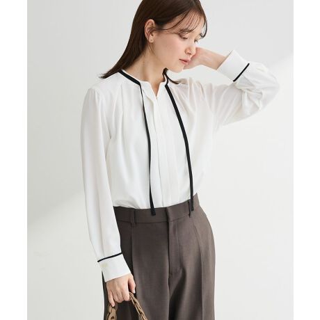 さりげないリボンで華やぐ、大人のきれいめブラウスシンプルな中に上品なアクセントを添えるリボンデザインが印象的なブラウスです。落ち着いた雰囲気のデザインに、フロントのリボンがほどよい華やかさをプラスし、大人のきれいめスタイルを演出します。フロントに施されたタックがやわらかなドレープ感を生み出し、自然な立体感で上品なシルエットを作ります。すっきりとしたネックラインは顔まわりをきれいに見せ、アクセサリーとの相性も良いのが魅力です。フロントホック仕様で着脱しやすく、毎日のコーディネートにも取り入れやすい一枚です。裾のサイドスリットが動きやすさを高め、ボトムインやアウトのどちらでもバランスよく着こなせます。オフィススタイルから休日のお出かけまで幅広く活躍し、上品カジュアルな装いを楽しめる万能アイテムです。※ホワイト系は、やや透け感あり。透け感[ややあり]