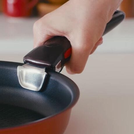 ●取っ手を握って固定、両サイドにあるボタンをカチッと押すだけで解除。ティファールなら片手でワンタッチ脱着が可能だから、調理中の取っ手の付け替えもラクラク。