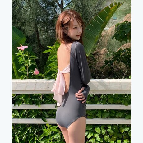 ・前脇の細かなギャザーが立体感を生み、身体のラインをすっきり見せてくれる長袖ワンピース水着。