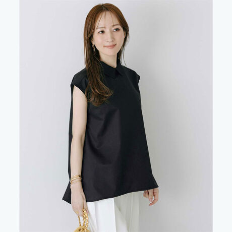襟のデザインが上品なノースリーブシャツブラウス。程よく立ち上がる襟元が顔まわりをすっきりと見せ、きれいめな雰囲気を演出してくれます。身体から離れるシルエットでラインを拾いにくく、さりげなく体型をカバーが可能のも嬉しいポイントです。一枚ではもちろん、ジャケットやカーディガンのインナーとしても映え、オフィスシーンにも安心して取り入れられる一枚です。[型番:BHXU2021]