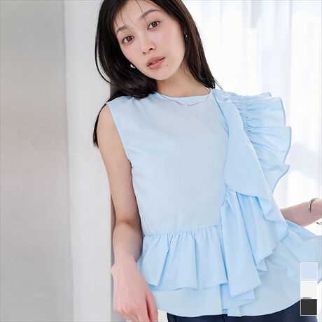 立体感のあるフリルが顔まわりに華やかさをプラスし、一枚で着映えするアイテムです。