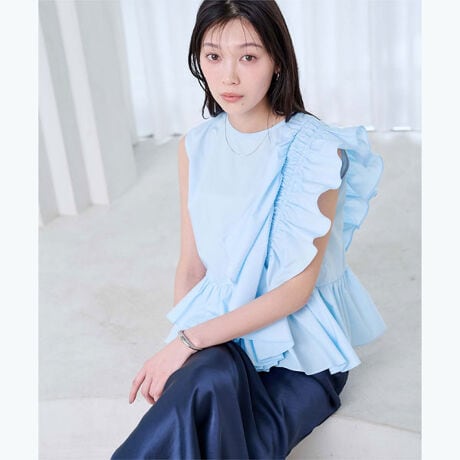 アシンメトリーにあしらったフリルデザインが目を引く、デザインブラウス。