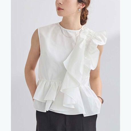 アシンメトリーにあしらったフリルデザインが目を引く、デザインブラウス。