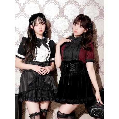 配色ピンタックとレース使いが縦ラインを強調し、甘さの中に凛としたゴシック感を漂わせる一枚。
