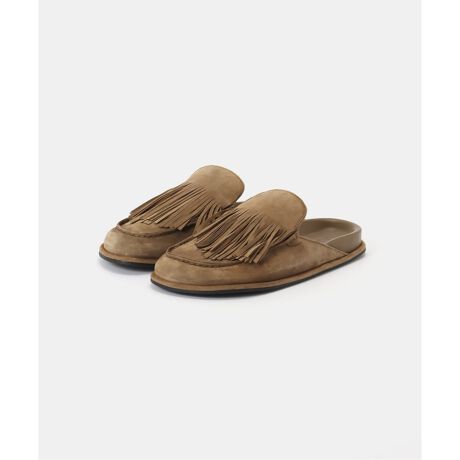 フリンジ付きのスエードサボは、さっと履ける手軽さが魅力◎