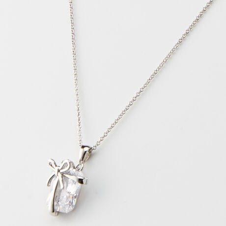 [型番:713404]存在感を放つ大粒のキュービックジルコニアにリボンを掛けた、まるで宝石のプレゼントのようなデザインのペンダントです。