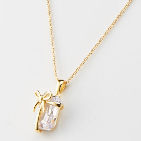 [型番:713404]存在感を放つ大粒のキュービックジルコニアにリボンを掛けた、まるで宝石のプレゼントのようなデザインのペンダントです。