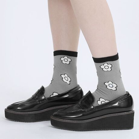 デイジーをコミックタッチで表現したソックス。◆ポイント・5弁のデイジーに、4弁のデイジーが隠れたデザイン・履き口、つま先、かかとが黒の配色◆コーディネートボトムスの裾からチラ見せコーデで、遊び心をプラス。[型番:226-971578]