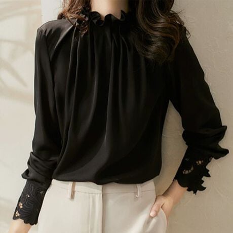 首元のフリルと袖口のレースが、さりげない華やかさを添えるブラウス。