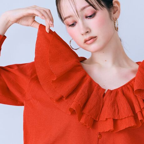 ・Vネックの襟元にラッフルカラーをティアード状にあしらいボリューム感を楽しむアイテム。