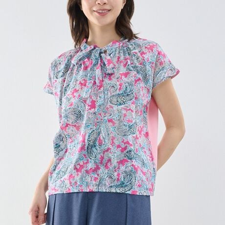 [型番:30-61-34-802]ペイズリージャガード柄が印象的なリボントップス。前身頃に柄生地、後身頃にカットソー素材を配したデザインで、見た目の華やかさと着心地の良さを両立しています。顔まわりを彩るリボンデザインが上品なアクセントに。やや透け感のある軽やかな素材で肌触りも良く、華やかな柄と色使いがコーディネートを明るく引き立てます。・透け感なし・後ろ身頃ストレッチあり・カラー展開はブラック、ピンク・サイズ展開は1(M)9号・3(2L)13号