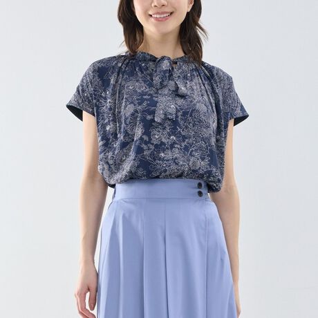 ラインフラワープリントが目を引くリボントップス。前身頃に柄生地、後身頃にカットソー素材を使用したドッキングデザインで、見た目の華やかさと着心地の良さを両立しています。首元のリボンがコーディネートのポイントになり、一枚でも着用しやすいデザイン。パンツスタイルはもちろん、スカートと合わせてタックインした装いもおすすめです。