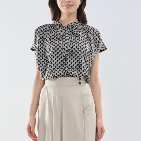 モロッカン調のジオメトリックプリントをあしらったリボントップス。前身頃に柄生地、後身頃にカットソー素材を使用したドッキングデザインで、見た目の華やかさと着心地の良さを両立しています。首元のリボンがコーディネートのポイントになり、一枚でも着用しやすいデザイン。クラシックな柄と落ち着いた配色で、きれいめからシックなスタイリングまで幅広く合わせやすい一着です。