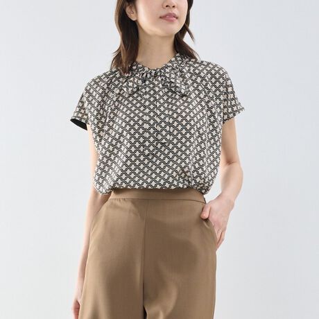 モロッカン調のジオメトリックプリントをあしらったリボントップス。前身頃に柄生地、後身頃にカットソー素材を使用したドッキングデザインで、見た目の華やかさと着心地の良さを両立しています。首元のリボンがコーディネートのポイントになり、一枚でも着用しやすいデザイン。クラシックな柄と落ち着いた配色で、きれいめからシックなスタイリングまで幅広く合わせやすい一着です。