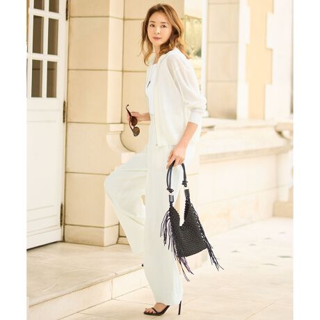 セットアップでも単品でも映える洗練ワイドパンツ■デザインシンプルで大人っぽい印象に仕上げたワイドストレートパンツです。腰まわりに程よくゆとりを持たせつつ、裾に向かってすとんと落ちる美しいシルエットが特徴です。ウエストまわりにはタブディテールを施し、ミニマルなデザインにさりげないアクセントをプラスしています。後ろウエスト部分はゴム仕様で、ストレッチ性のある素材ならではの快適なはき心地も魅力です。同素材のジレ(VRWRLM0401)やジャケット(JKWRLM0401)とのセットアップはもちろん、シンプルなトップスから華やかなブラウスまで幅広く合わせやすく、麻混素材ならではの表情がスタイリングを上品に引き立ててくれます。※オフ(002)のみ、裏地が付いています。■素材タテ糸にリネン、ヨコ糸にポリエステルとレーヨンの混紡したストレッチ糸を使用した素材です。リネンならではのドライでさらっとした風合いがありながらも、レーヨンのしなやかさと柔らかさを併せ持った大人っぽい表情感が魅力。程よくストレッチを効かせた着心地の良さと肌離れの良いタッチが夏に向けておすすめの素材感です。UVカット、接触冷感、吸水速乾の機能性の高さもポイントです。■同素材ジャケット(JKWRLM0401)ジレ(VRWRLM0408)