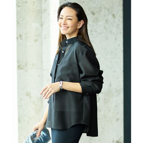 軽やかに纏う大人のシアーシャツ■デザインシアーで程よいハリ感のある素材を使用した、ビッグシルエットのシャツです。センターバックにタックを施し、身頃にあえてたっぷりとしたゆとりを持たせることで、上品で女性らしいニュアンスを表現しました。胸元の大きなポケットがさりげないアクセントになります。前を開けて羽織りとしても着用でき、ゆとりのあるサイズ感で抜け感のある着こなしを楽しめます。■素材タテ糸に極細繊維を使用し、ほどよい反発感となめらかな光沢を表現しました。ヨコ糸にはスパン糸を用いることで、ふくらみのあるマットな質感をプラスし、上品な表情に仕上げています。軽量で繊細な透け感がありながら、適度なハリとコシを備えた素材です。