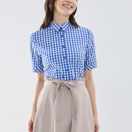 ギンガムチェック柄が印象的な半袖シャツ。シンプルなデザインながら、袖丈や襟のバランスにこだわり、幅広いスタイリングに取り入れやすい一着に仕上げています。ウエストにかけてシェイプするシルエットが、美しい体のラインを演出します。程よく落ち着いた配色で大人のカジュアルにもなじみやすく、パンツにもスカートにも好相性。デイリーからきれいめまで幅広いシーンで活躍します。