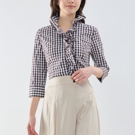 ギンガムチェック柄が印象的なスタンドフリル七分袖シャツ。あえて落ち着いたトーンの配色にすることで、大人のスタイリングにも取り入れやすいデザインに仕上げています。顔まわりを華やかに見せる大きめのフリルがポイントで、上品な存在感を演出。フレアスカートから白パンツまで幅広いボトムと合わせやすく、世代を問わず楽しめる一着です。