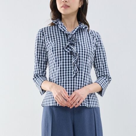 ギンガムチェック柄が印象的なスタンドフリル七分袖シャツ。あえて落ち着いたトーンの配色にすることで、大人のスタイリングにも取り入れやすいデザインに仕上げています。顔まわりを華やかに見せる大きめのフリルがポイントで、上品な存在感を演出。フレアスカートから白パンツまで幅広いボトムと合わせやすく、世代を問わず楽しめる一着です。