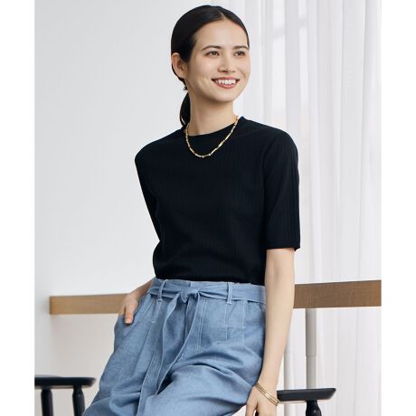 コンパクトなのにラインを拾いにくいニットプルオーバー1枚でサマになり、アンサンブルならより上品に。着こなしの幅を広げる万能アイテム■デザインワイドボトムにも好相性な、トレンド感のある着こなしが自然に決まるニットプルオーバーです。針抜きリブ編みにすることで、すっきりとしたコンパクトシルエットながら、身体のラインを拾いにくく仕上げました。トップスをコンパクトにまとめる、旬のバランスを楽しめる1枚です。同素材のカーディガン(KRW7LM0456)とのセット着用はもちろん、単品でも着回していただけます。■素材セルロース、ポリエステル、シルクの3素材を使用した素材です。快適さや肌なじみの良さ、なめらかな風合いを兼ね備えており、心地よい着用感です。■同素材カーディガン(KRW7LM0456)