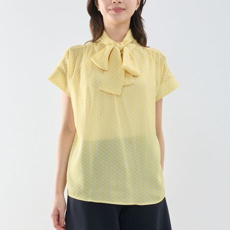 小さな幾何柄プリントをあしらったボウタイ半袖ブラウス。遠目には無地のように見えるためコーディネートに取り入れやすく、幅広いスタイリングに対応します。ポリエステルのジョーゼット素材を使用し、やわらかな肌当たりで快適な着心地に。夏らしいブルーとイエローのカラー展開も魅力です。ボウタイは取り外し可能で、シーンに合わせてアレンジを楽しめます。