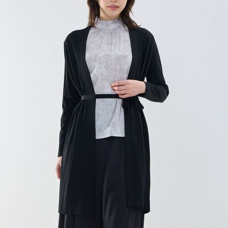 着流しデザインのロングカーディガン。背中部分に布帛素材をドッキングすることで、軽やかな印象に仕上げています。背面のスリットやウエストのリボンがさりげないアクセントに。さらりとした着心地で、季節の変わり目や冷房対策にも取り入れやすい一着。シンプルなコーディネートに羽織りとして加えるだけで、抜け感のあるスタイリングが完成します。