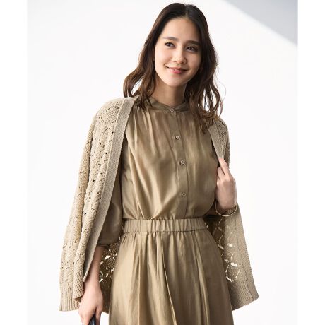 スタイリングを引き立てるアクセントカーディガン■デザイン素材表情豊かな、春らしいファンシーニットカーディガンです。ややオーバーサイズに仕上げ、程よくボリュームを持たせることで、存在感のあるプリントアイテムにも負けない、印象的な1枚にしています。華やかな柄のワンピースなどに合わせるだけで、スタイリングのアクセントとして活躍します。■素材はしごテープ状のペーパーヤーンやブークレ調のコットンなど、表情の異なる糸を組み合わせました。これらを色味を統一させることでシックにまとめ、大人の女性らしいファンシーなミドルゲージニットに仕上げています。ファンシー素材ながら天然素材でまとめているため清涼感があり、肌離れの良いドライタッチな質感に仕上がっています。