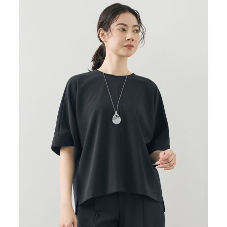 オン・オフ頼れるシンプルTシャツブラウス■デザインほどよくゆとりのある身幅で、一枚でも楽に着用できるTシャツブラウスです。襟ぐりには別布のサテン素材を使用し、顔まわりにさりげない華やかさをプラスしました。きちんと感のあるデザインで普段使いはもちろん、通勤などオンシーンにも取り入れやすい一着です。配色は、フラックス(033)にはブラックの別布を、ブラック(005)には同色の別布を採用しています。■素材梳毛調のストレッチポリエステルをベースに、オリジナルのスラブ糸を使用したツイル素材です。ナチュラルワッシャー加工と減量加工を組み合わせることで、ソフトな風合いと程よい落ち感を引き出しました。きれいな表情を保ちながらも快適な着心地が魅力で、接触冷感・吸水速乾・UVケア・着用時の防シワといった機能性も備えています。■同素材ジャケット(JKWMLM0411)パンツ(PRWMLM0411)