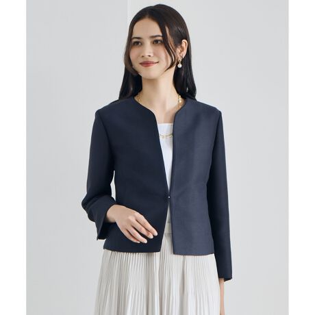 セレモニーシーンでも活躍する上品ジャケット■デザインコンパクトなシルエットと短めの着丈で、ボレロのような感覚で着用できるノーカラージャケットです。程よくゆとりを持たせつつ、ウエスト位置を高めに設定してさりげなく、スタイルアップして見えるバランスに仕上げました。衿ぐりから前立て、袖口には極細のサテンパイピングを施し、シンプルな中にも素材の持つ繊細な光沢感が引き立つ、上品な華やかさをプラスしています。サテンやシフォン、レースのワンピースに合わせて、きちんと感が求められるセレモニーシーンにも活躍する一着です。■素材極細の光沢糸と毛羽立ちの少ないポリエステル糸を使用した二重織素材です。主張しすぎない繊細な光沢感が、上品でリッチな表情を演出します。二重織でありながら軽さがあり、程よいハリ感によって美しいフォルムをキープできるのも特徴です。UVカット機能付きです。