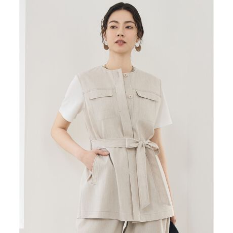 カジュアルを品よく整えるサファリジレUVカット、接触冷感、吸水速乾の機能が嬉しい1着■デザインスリーブレスでジャケット感覚に羽織れる、ミドル丈のジレです。アウトポケットを配したサファリテイストのディテールを、リネン混素材で仕立てることで、カジュアルな中にも大人っぽさを感じる一着に仕上げました。サッシュベルト付きで、ウエストマークした着こなしもおすすめです。ベルトを外して着用すると、すっきりとしたボクシーシルエットになり、腰まわりをさりげなくカバーする着丈も魅力です。セットアップでの着用はもちろん、ワンピースやシンプルなトップスに合わせて、幅広いスタイリングに活躍します。■素材タテ糸にリネン、ヨコ糸にポリエステルとレーヨンの混紡したストレッチ糸を使用した素材です。リネンならではのドライでさらっとした風合いがありながらも、レーヨンのしなやかさと柔らかさを併せ持った大人っぽい表情感が魅力です。程よくストレッチを効かせた着心地の良さと肌離れの良いタッチが夏に向けておすすめの素材感です。UVカット、接触冷感、吸水速乾の機能性の高さもポイントです。■同素材ジャケット(JKWRLM0401)パンツ(PRWRLM0401)